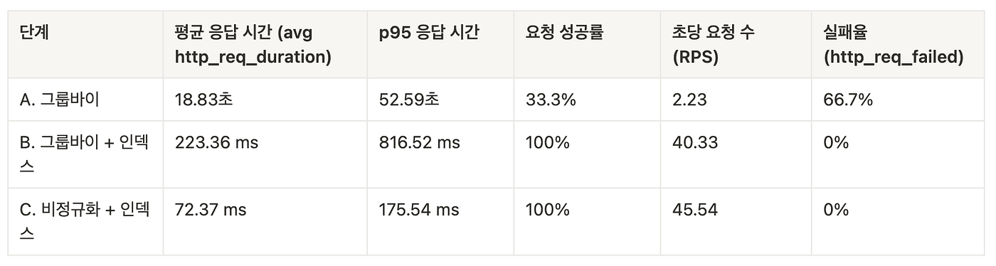 단계별로 인덱스 → 비정규화 → 캐시를 적용하면서 성능을 끌어올렸다.