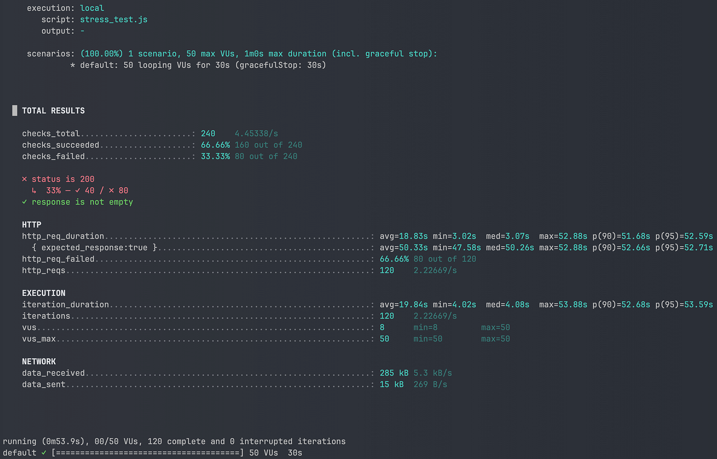 캐싱을 적용한 이후 평균 응답 시간은 약 20ms, p95는 약 53ms로 안정화됐다.